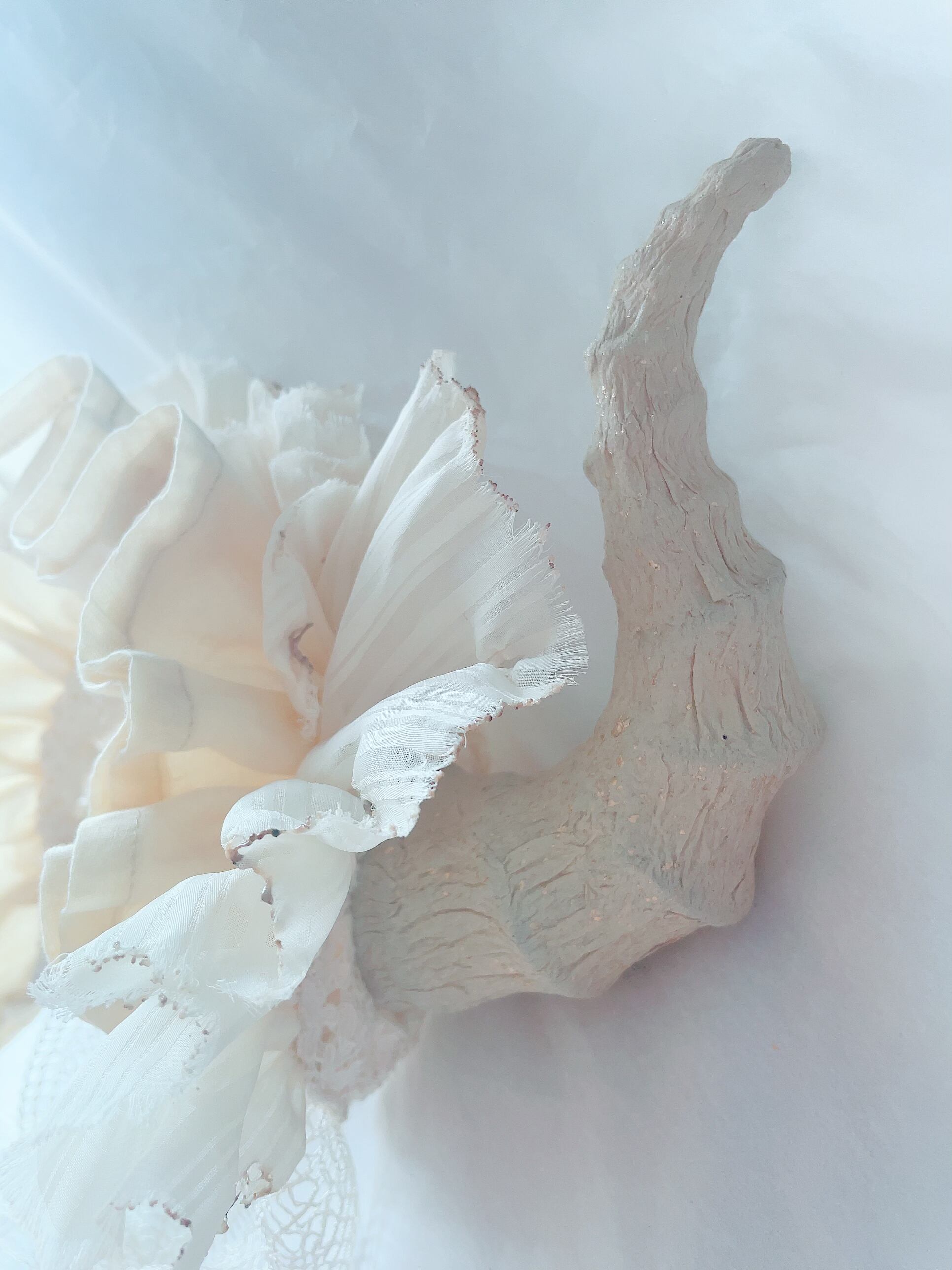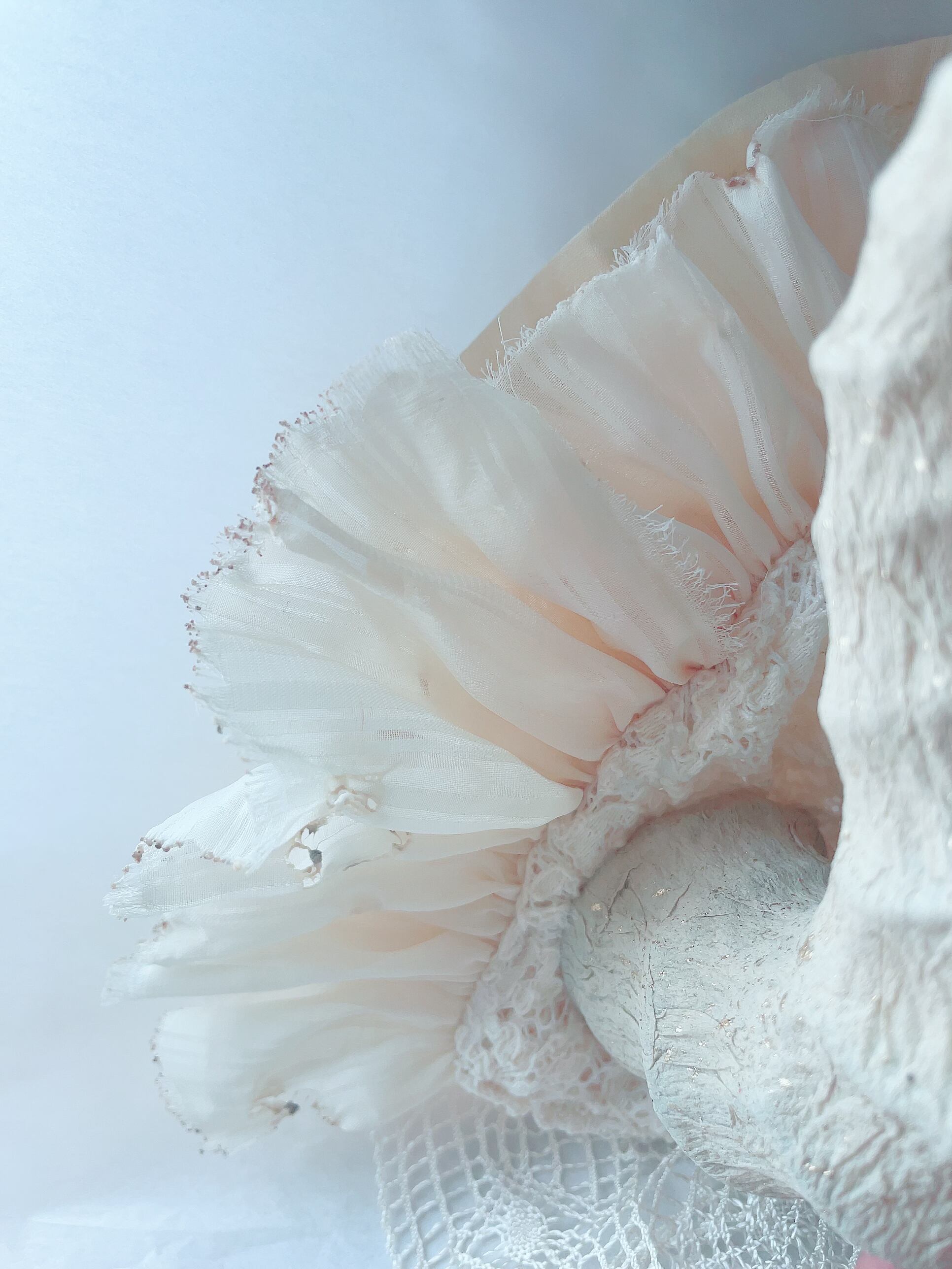 フリルの一部を焼いて、ただれさせて、何か不穏なことがあったような、この世に存在しないような、こわ〜い様子にしました。(本当に生地を焼いているので煙の香りがするかも。)