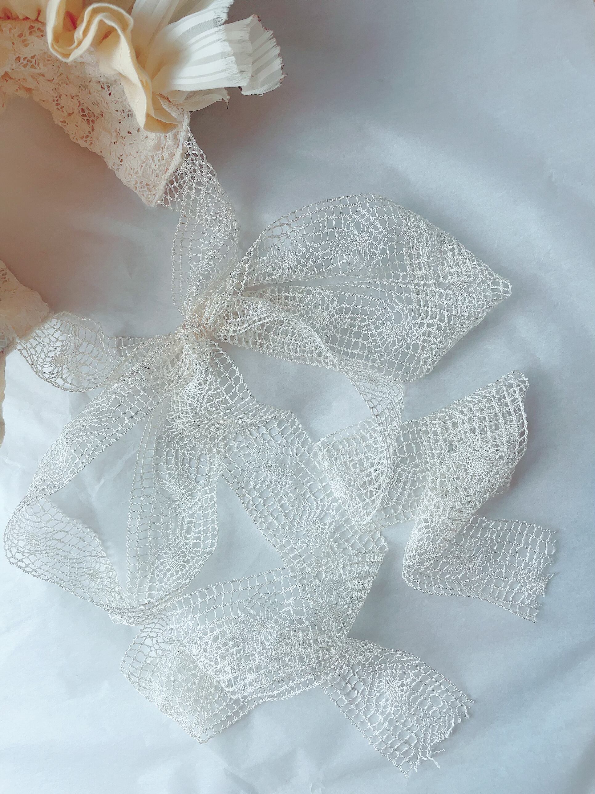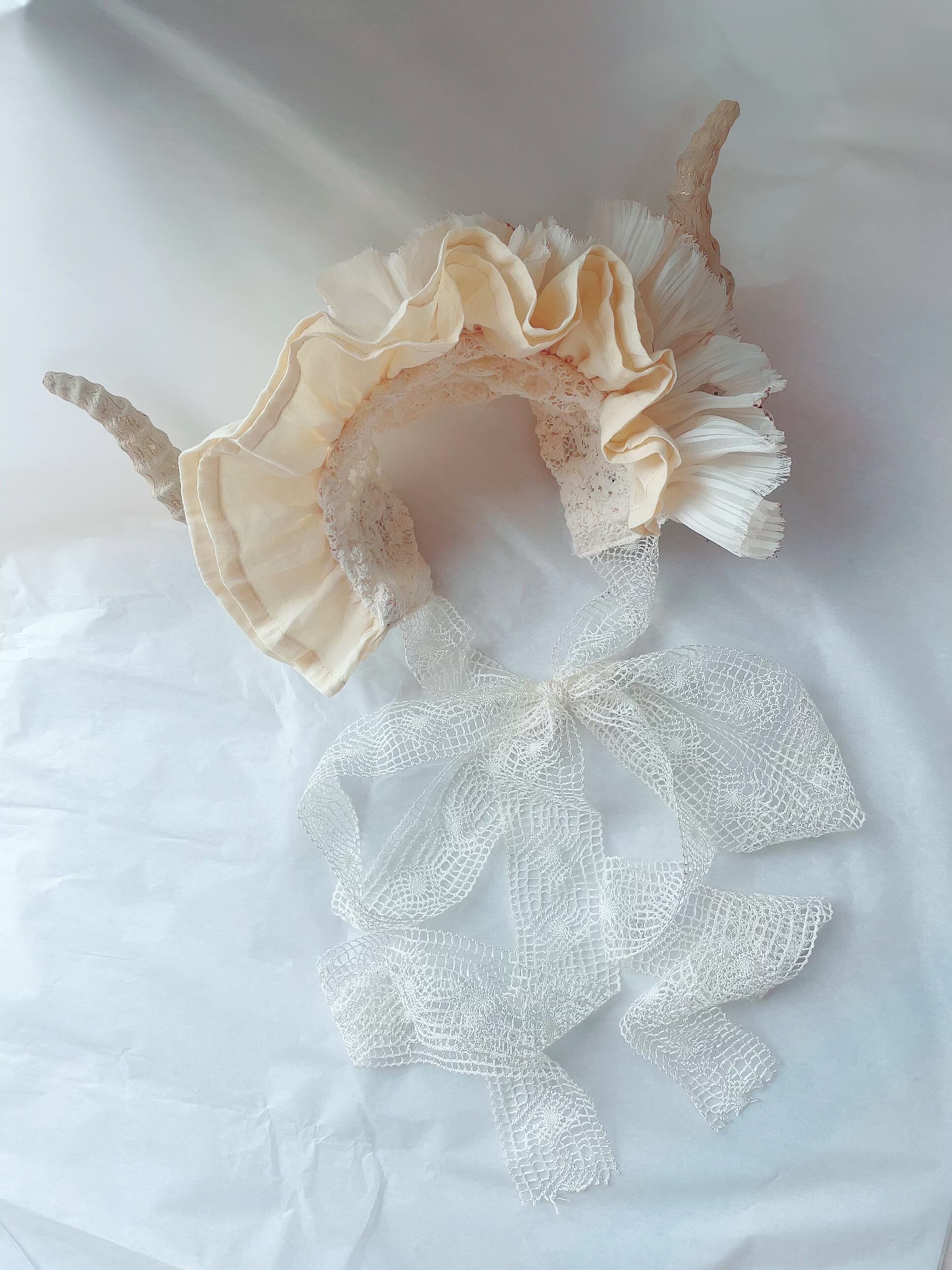 骨をイメージした色のツノに、繊細なコットンレースのリボン。